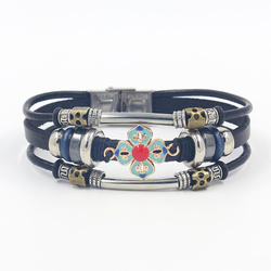 Stile bohémien processo di olio gocciolante di antico braccialetto di perline in pelle multistrato fiore in lega d'argento